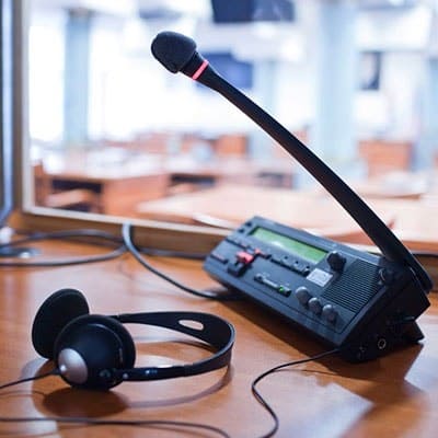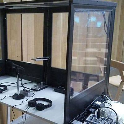 La cabina de interpretación es el área de trabajo de los intérpretes traductores. La función de las cabinas es aislar las voces de los intérpretes evitando que los participantes las escuchen. Aloja también las consolas, micrófonos y audífonos.